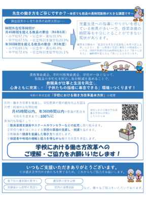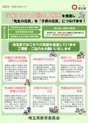 埼玉県教育委員会より、「学校における働き方改革リーフレット」が届きました。埼玉県ではこれらの取組を推進しています。保護者・地域の皆様には、学校における働き方改革へのご理解・ご協力をお願いいたします。