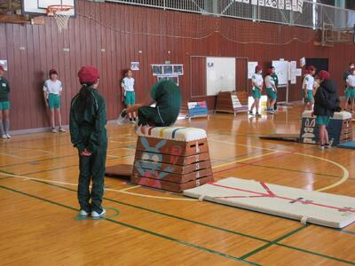 本時は、5年生が台上前転に取り組みました。