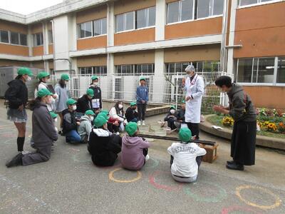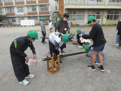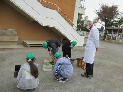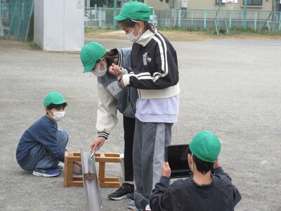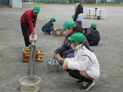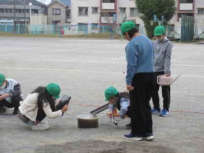 2025,11,13 地層をつくろう ~6年~ 11/13 6年の理科の時間です。 外で地層を作る実験をしました。 グループで協力しながら行います。 流れる水のはたらきによって、土が運ぱんされ、れき、砂、どろの層を見ることができました。 <6-1> <6-2>