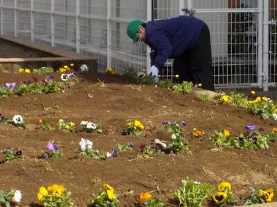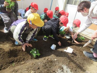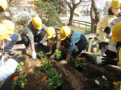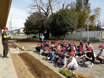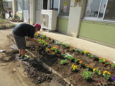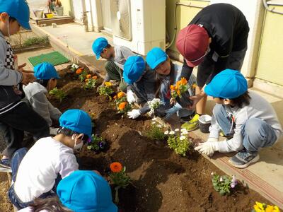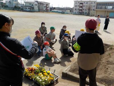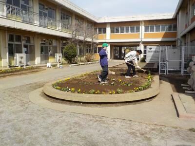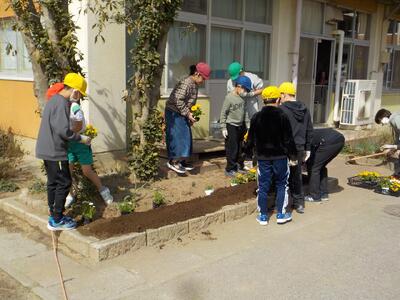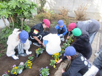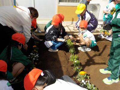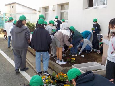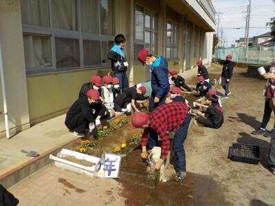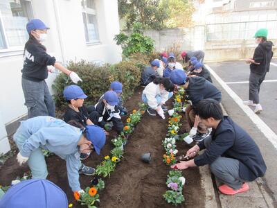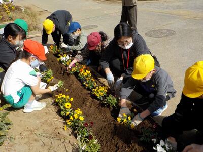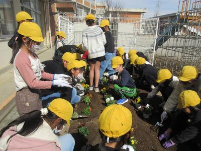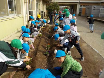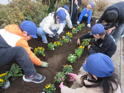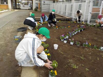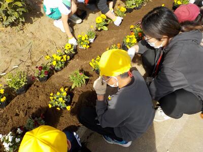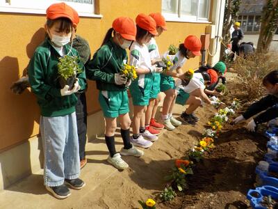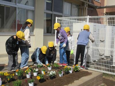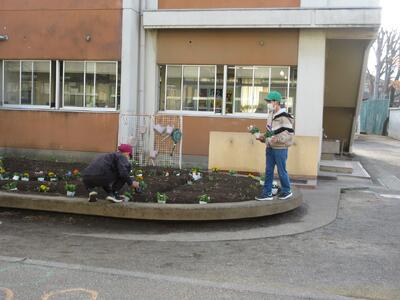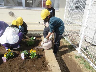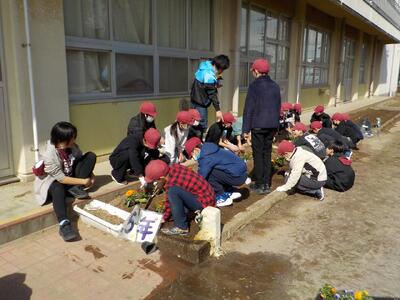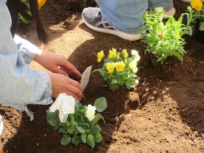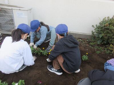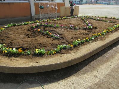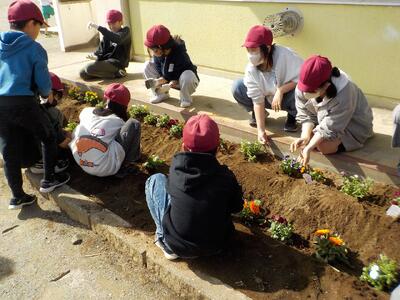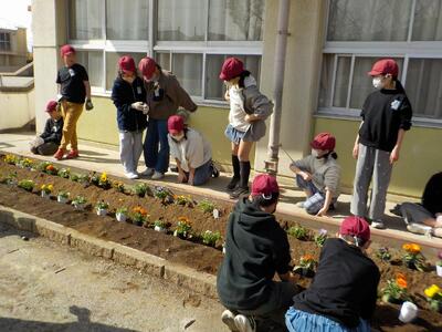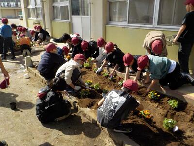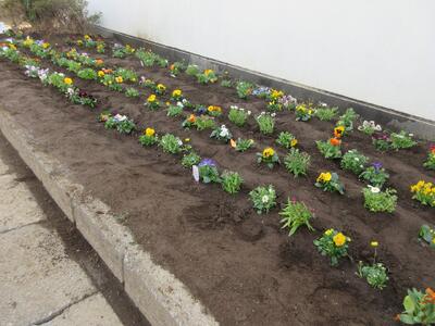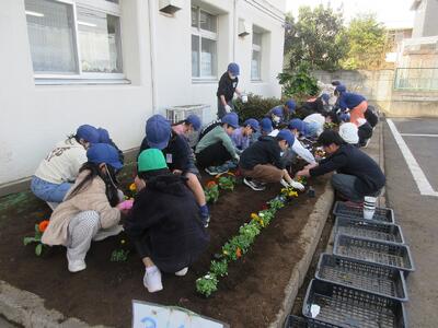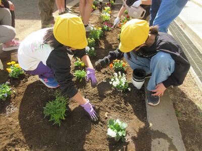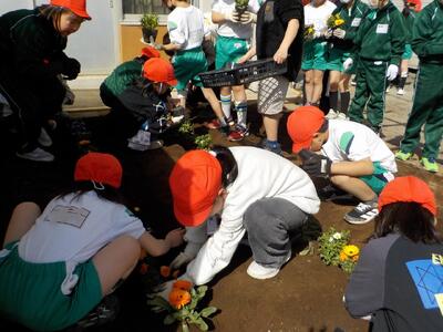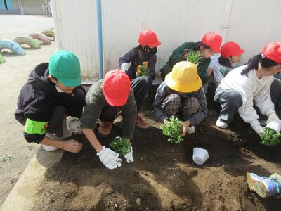 栽培委員会の説明の後、各学年が学年園にきれいに花を植えました。