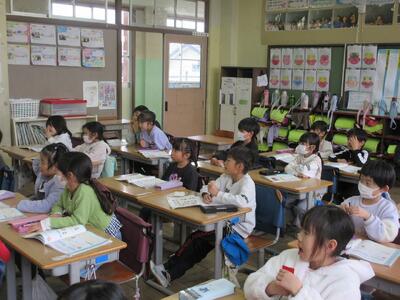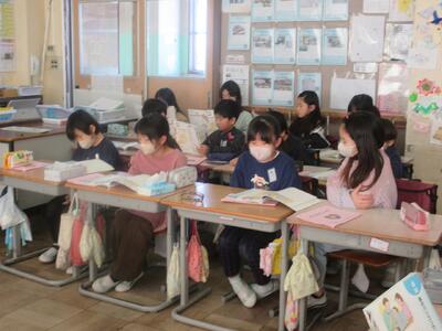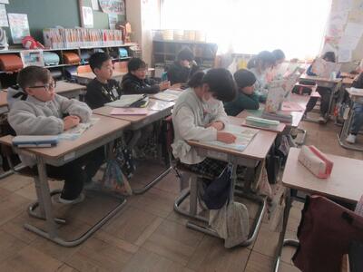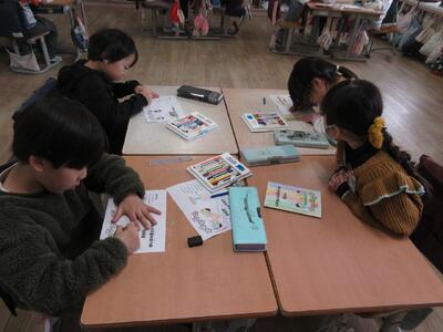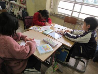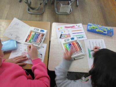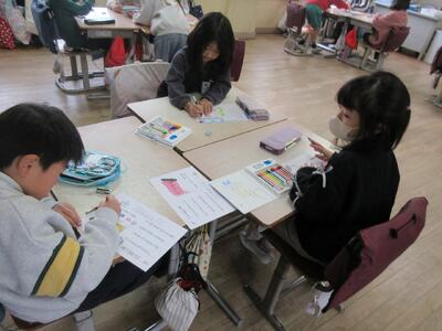 3月に行われる「6年生の卒業を祝う会」の招待状づくりを2年生が行っていました。