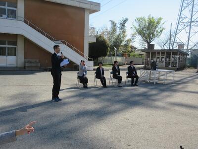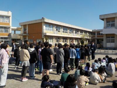 澄んだ青空の下、令和8年度第1学期始業式が校庭で行われました。